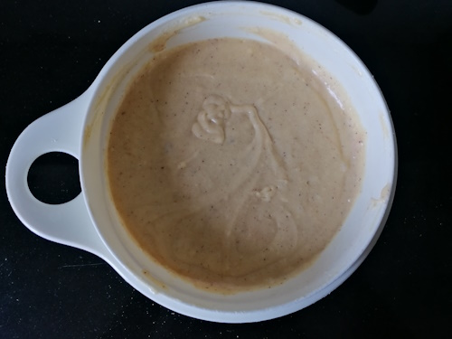 Voeg de droge ingrediënten toe aan de beslagkom met natte ingrediënten en meng door elkaar.