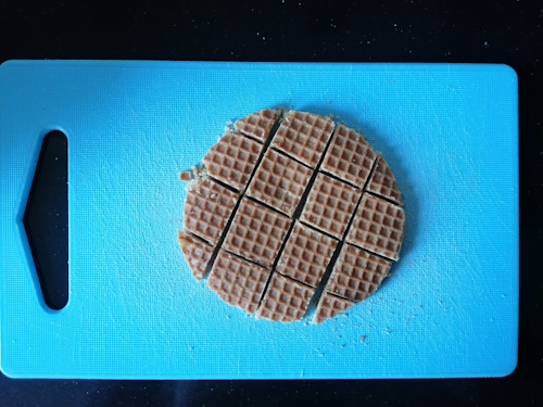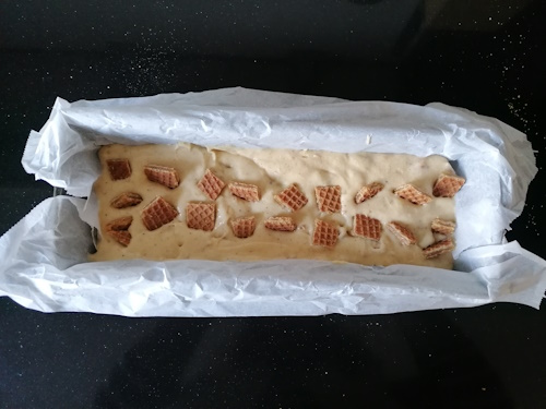 Snijd de stroopwafels in stukjes. Houd een aantal stukjes apart voor bovenop de cake, de rest meng je door het beslag.