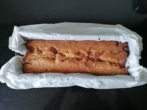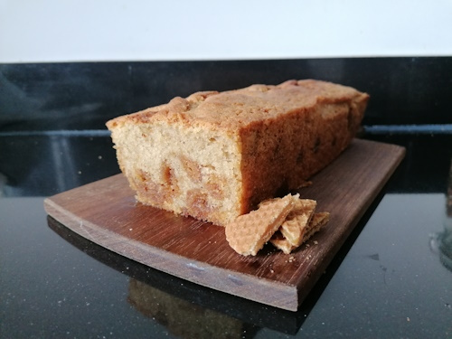 Doe het beslag in een ingevette en/of met bakpapier beklede cakevorm. Doe nog een aantal stukjes stroopwafel bovenop. Bak de cake gedurende 40 minuten op 170°C.