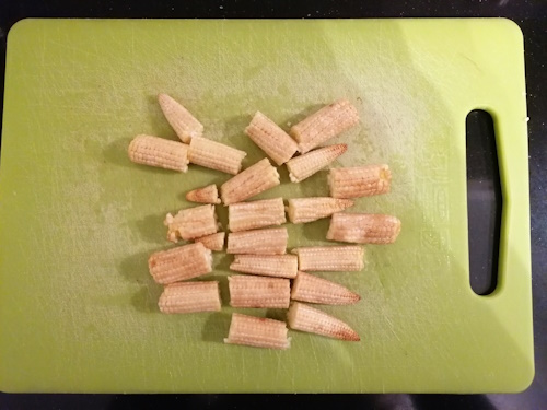 Snijd de paprika (op de foto zie je gele, maar de kleur maakt niet uit, in dit recept gebruikte ik oranje) en courgette in reepjes. Snijd de babymais in helften of derden.