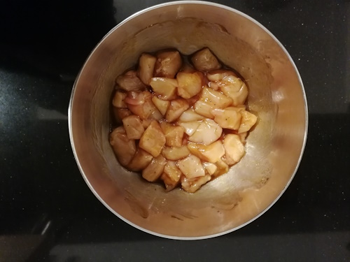Snijd de kip in stukjes en doe deze samen met de marinade in een kom. Laat even staan terwijl je ondertussen de rest snijdt.