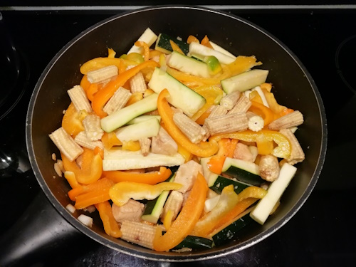 Voeg daarna de paprika, courgette en babymais toe.