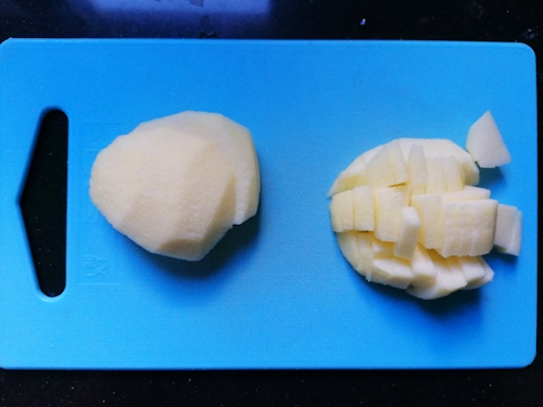 (zie foto). Doe de appelstukjes in een pan, samen met het water, de suiker en kaneel. Kook ze 10 minuutjes tot ze wat zachter zijn. Roer af en toe om. De appelstukjes