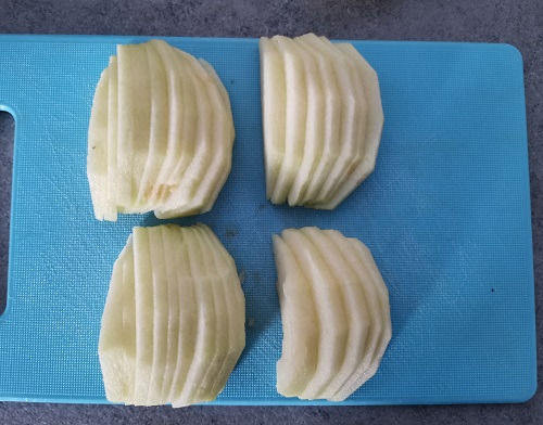 Doe de helft tot 2/3e van het beslag in een met bakpapier beklede cakevorm. Leg daarbovenop de helft van de plakjes appel.