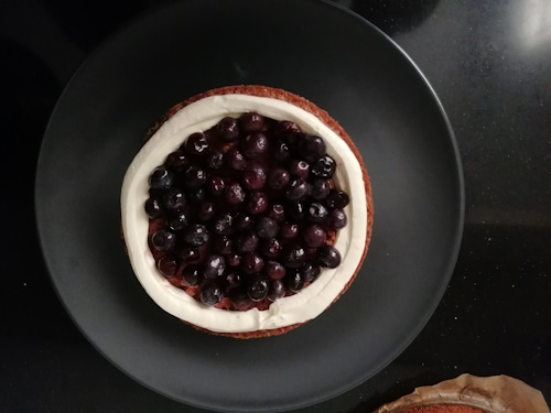 Verspreid de helft van de blauwe bessen op de cakelaag. Smeer daar nog wat botercrème over uit zodat het tussen de blauwe bessen komt.
