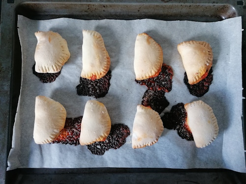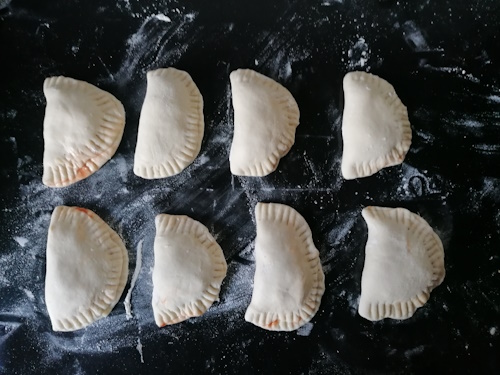 Vouw de pockets dicht en maak de randjes dicht met een vork. Leg de pizza pockets op een met bakpapier beklede bakplaat.