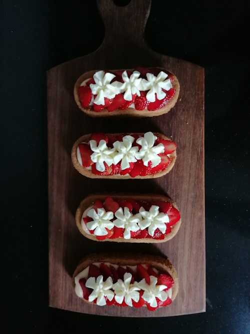 Verdeel de aardbeien over de slof en maak het geheel eventueel af met slagroom.