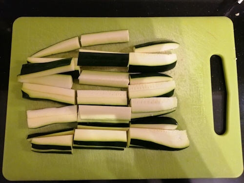 Snijd de paprika (op de foto zie je gele, maar de kleur maakt niet uit, in dit recept gebruikte ik oranje) en courgette in reepjes. Snijd de babymais in helften of derden.