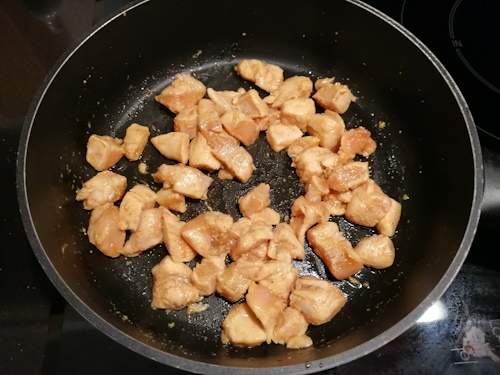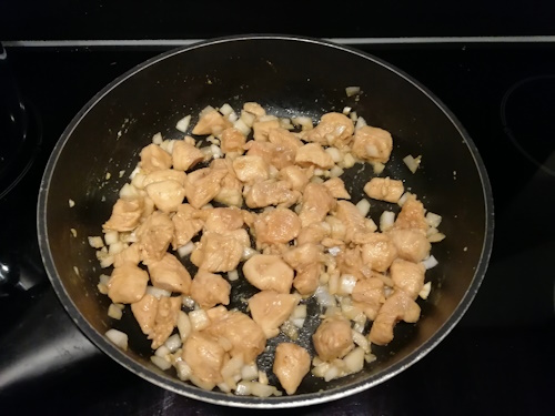 Bak de kip in een pan. Als hij (bijna) gaar is, doe je de ui en knoflook erbij.